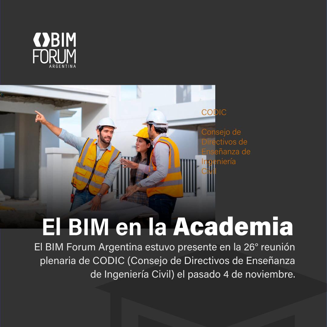 En el marco de la 26° reunión plenaria de CODIC (Consejo de Directivos de Enseñanza de Ingeniería Civil) realizada el pasado 4 de noviembre, el BIM Forum Argentina se hizo presente a través de la mesa de trabajo de educación para compartir visiones referidas a la implementación BIM en el ámbito universitario para la carrera de ingeniería civil.